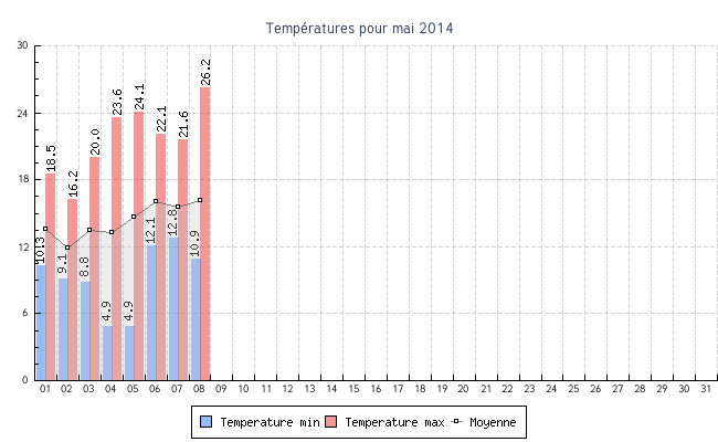 | 08 | 10.9 °C | 26.2 °C | 16.1 °C | 2.1 km/h (14.0 km/h) | N |